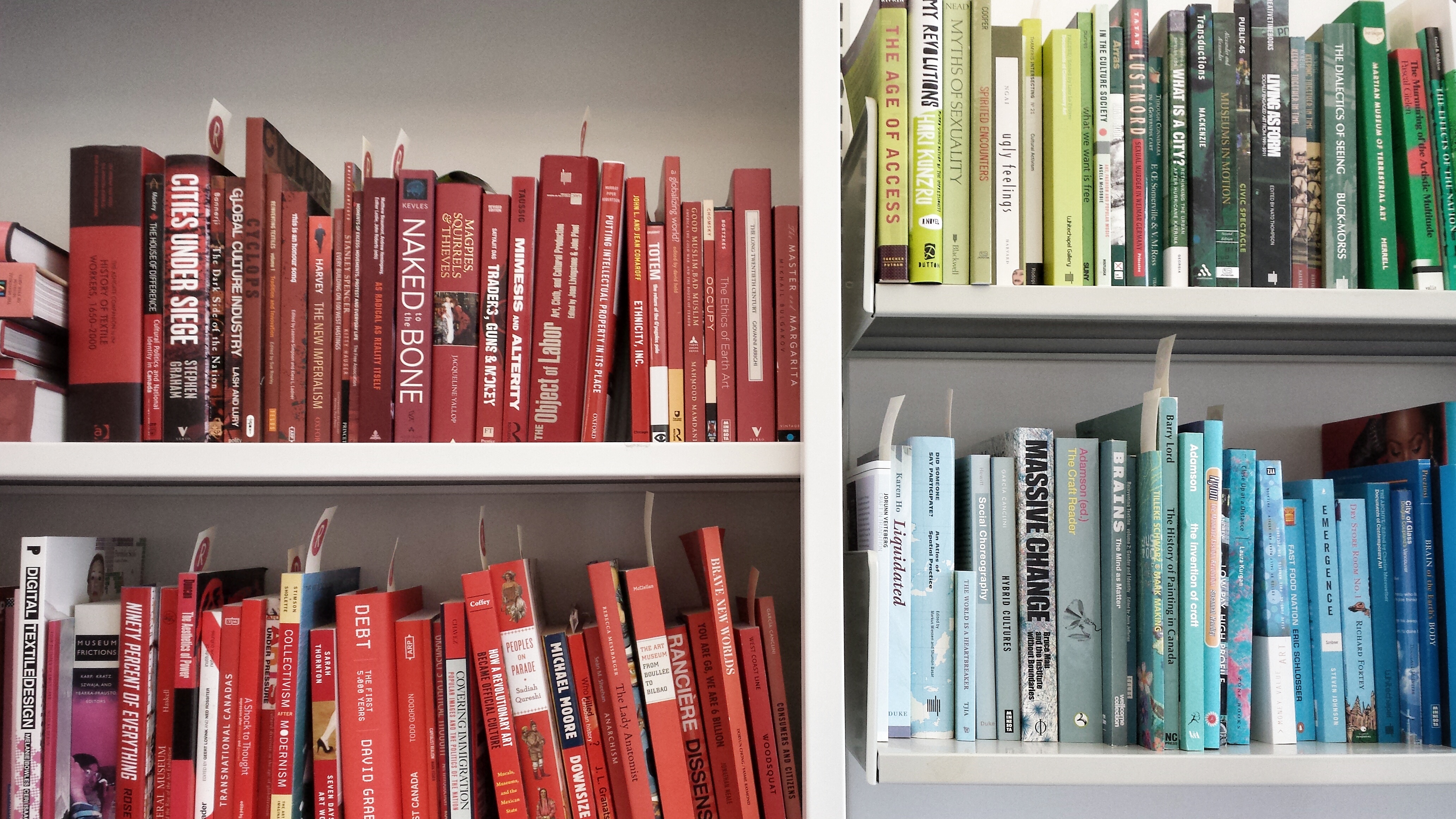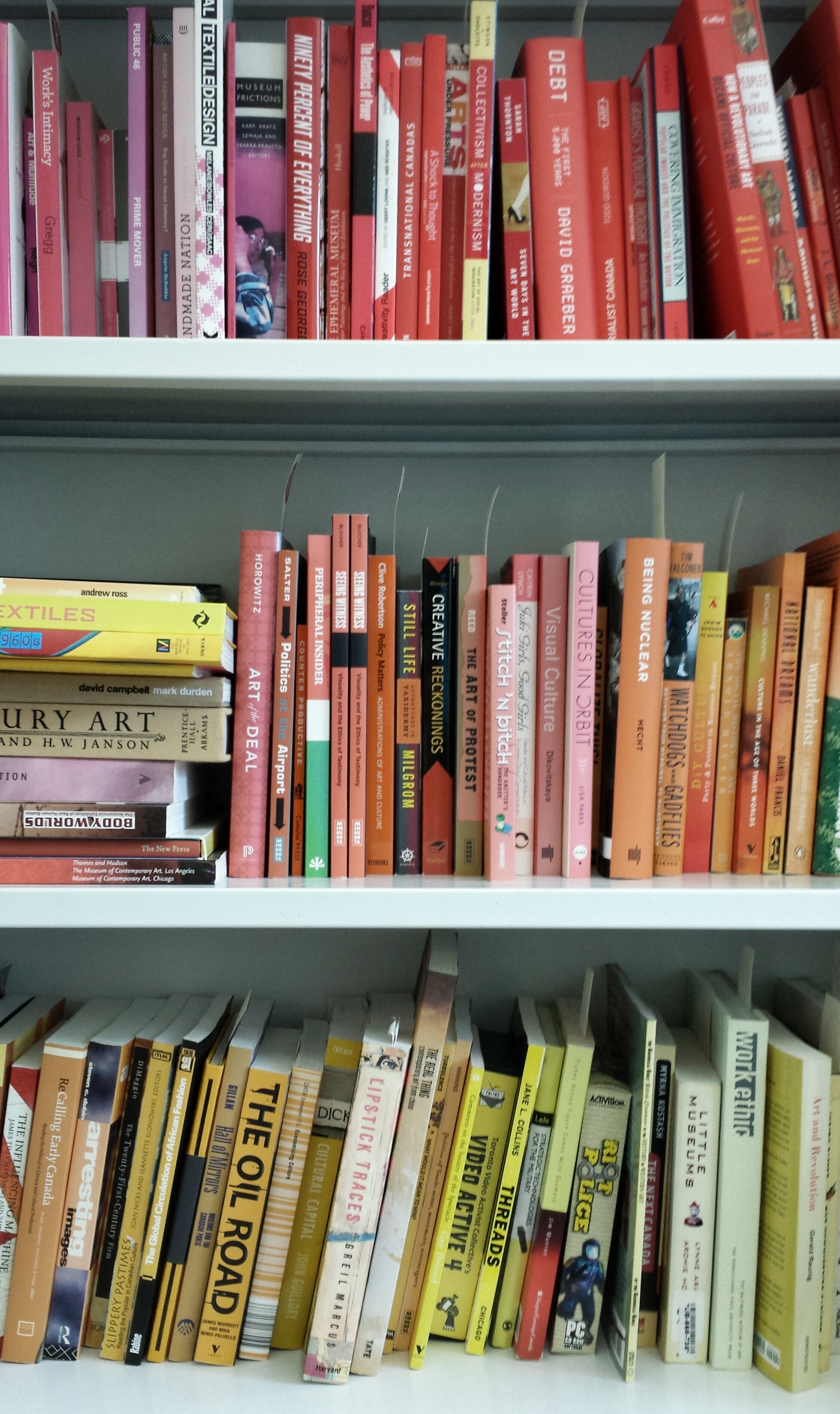 According to Dr. Robertson, the reason for sorting the books by colours rather than by subjects is to encourage browsing and discovery through serendipity. She said that a digital catalogue could sometimes be too rigid. Dr. Robertson’s research interests include museum studies and global justice activism. Western’s John Labatt Visual Arts Centre is tucked away at one end of the campus and the micro-museum and library is her way to bring people to check out the Visual Arts Department. If nothing else, it surely made me visit the VAC for the first time.
